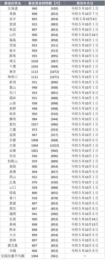 都道府県の令和5年度地域別最低賃金額及び発効年月日は、以下のとおりです。